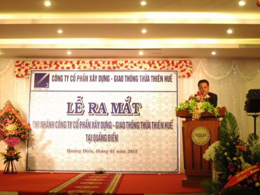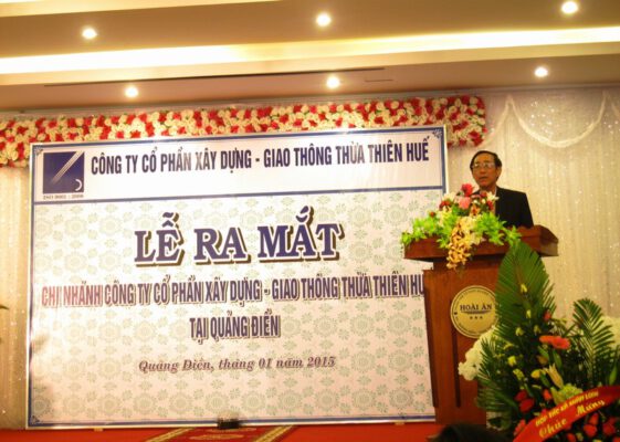 Đại biểu tham dự lễ ra mắt chi nhánh Quảng Điền Công ty cổ phần XD-GT Thừa Thiên Huế với bề dày hơn 40 năm xây dựng và phát triển, Công ty đã trải qua nhiều bước thay đổi thăng trầm, từ xí nghiệp cầu đường 4 của Bình Trị Thiên, rồi chia tách khi chia tách tỉnh Bình Trị Thiên năm 1990, rồi lại đến sáp nhập với một đơn vị khác vào đầu năm 2002 và được chuyển đổi cổ phần vào đầu năm 2006. Dù có nhiều thay đổi, có thuận lợi, có những lúc gặp khó khăn tưởng chừng như không vượt qua nổi, nhưng bằng quyết tâm của Đảng Bộ, toàn bộ cán bộ công nhân viên Công ty đã chèo lái thành công con thuyền doanh nghiệp, đưa doanh nghiệp phát triển bền vững. Để minh chứng cho sự tăng trưởng và phát triển đơn vị, tạo thêm công việc làm cho người lao động góp phần hơn nữa nghĩa vụ ngân sách với địa phương. Sau khi tìm hiểu về thị trường tại địa bàn huyện Quảng Điền, tìm hiểu quy hoạch tổng thể, quy hoạch kinh tế – xã hội tại địa phương. Được sự đồng ý của Lãnh đạo của địa phương, lãnh đạo huyện Quảng Điền; sự thống nhất cao trong Đảng uỷ, HĐQT, ban Tổng giám đốc công ty, Công ty đã quyết định thành lập chi nhánh tại Huyện Quảng Điền. Đánh dấu thêm bước phát triển công ty, Ông Trần Chính Tổng giám đốc công ty cho biết sau khi chi nhánh Quảng Điền đi vào hoạt động sẽ góp phần nâng cao doanh thu, lợi nhuận cho Công ty, tạo công việc làm cho người lao động, thực hiện tốt nghĩa vụ nộp ngân sách tại địa phương, các hoạt động xã hội khác.